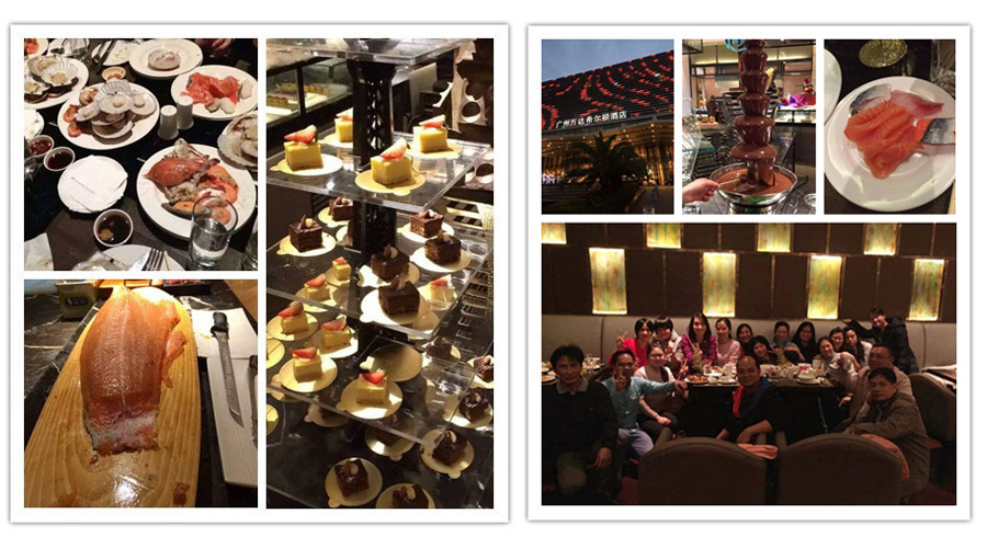 2015年12月30日晚上,公司全体员工齐聚广州白云万达希尔顿五星级酒店一起享用自助餐,入选“人气最高自助餐排行榜”第一名的白云万达希尔顿酒店感趣自助餐厅座落于白云新城,地处风景怡人的白云山脚下,环境舒适高雅。酒店为万达广场的一部分,扶梯举步可达步行街、购物中心、美食天堂、名品店、Imax电影院及各大娱乐点。更特别的是,这里晚上的夜景非常漂亮,结合绚丽的圣诞灯饰,整个现场流光溢彩,明亮照人。希尔顿酒店的一楼的自助餐厅是开放式厨房,里面提供各种各样的美食,有三文鱼、羊肋排、牛排、各式海鲜、刺身寿司、甜品、饮品等等。聚会中,员工聚餐气氛热闹非凡,每个人的脸上都洋溢着欢乐的笑容,尽情地品尝和分享鲜味可口的美食。大家有说有笑,相互分享美食心得、个人趣事,其乐融融,十分温馨。